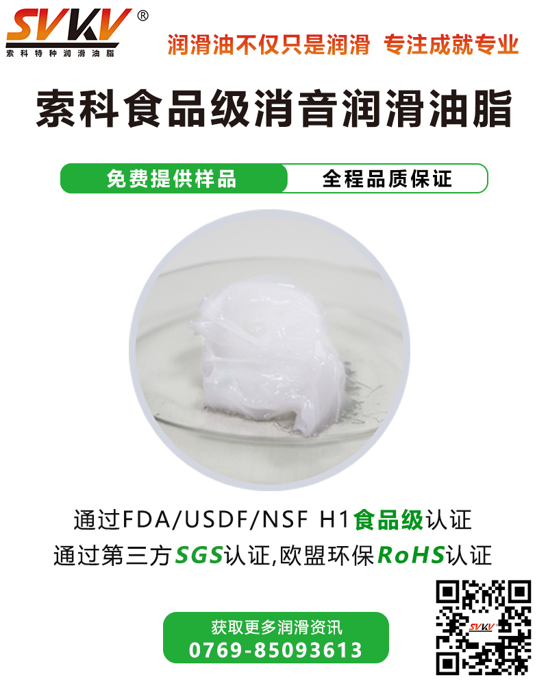 索科SVKV食品級(jí)消音潤(rùn)滑油脂,選用食品級(jí)基礎(chǔ)油和無(wú)毒無(wú)害的添加劑精制而成,專(zhuān)為食品醫(yī)療設(shè)備所研制。索科SVKV食品級(jí)消音潤(rùn)滑油脂符合美國(guó)FDA和USDA法規(guī)標(biāo)準(zhǔn),并通過(guò)USDA/NSF-1食品級(jí)認(rèn)證,保障設(shè)備產(chǎn)品的衛(wèi)生安全。