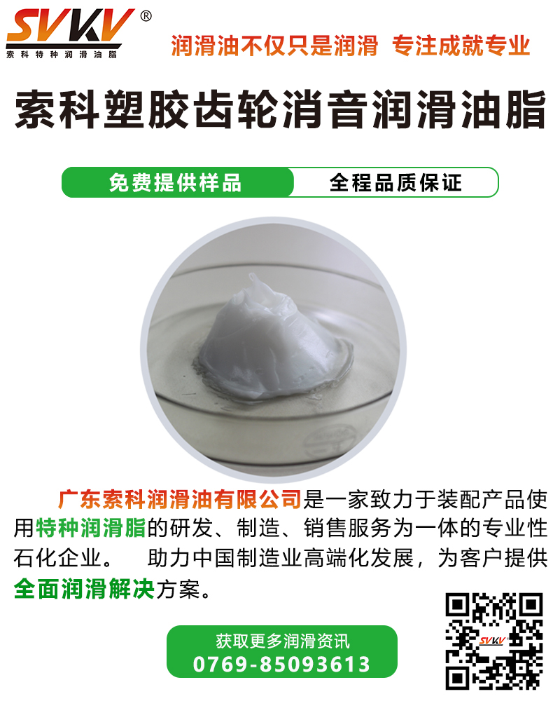 廣東索科潤滑油有限公司是一家致力于裝配產品使用特種潤滑脂的研發、生產、定制、服務為一體的專業性石化企業。致力為制造業客戶,提供專業的選油方案,協助客戶解決產品裝配時的潤滑難題,還可根據客戶特殊需求訂做適合的潤滑油品。有效提高產品性能、減低維護成本,索科助力制造業高端化發展! 主要產品有: 齒輪消音潤滑脂|高溫潤滑脂|食品級潤滑脂|齒輪消音潤滑脂|防水潤滑脂 導電油脂|軸承油|硅油|干性皮膜潤滑劑|低溫潤滑脂|阻尼脂|全氟油脂