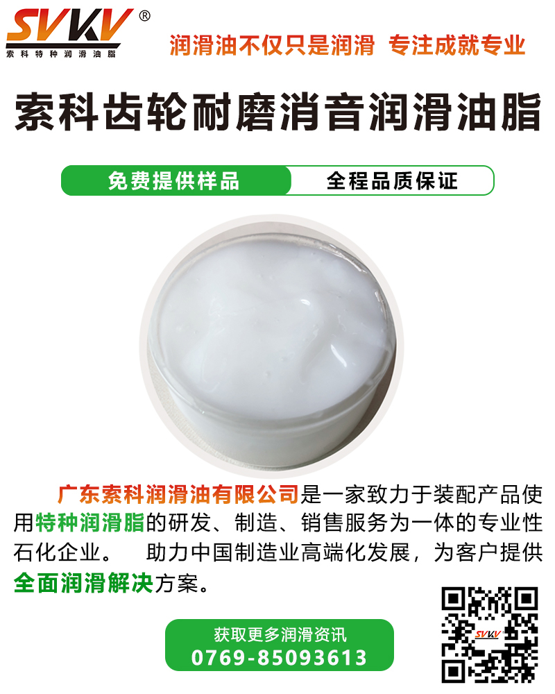 廣東索科潤滑油有限公司是一家致力于裝配產品使用特種潤滑脂的研發、生產、定制、服務為一體的專業性石化企業。致力為制造業客戶,提供專業的選油方案,協助客戶解決產品裝配時的潤滑難題,還可根據客戶特殊需求訂做適合的潤滑油品。有效提高產品性能、減低維護成本,索科助力制造業高端化發展!
